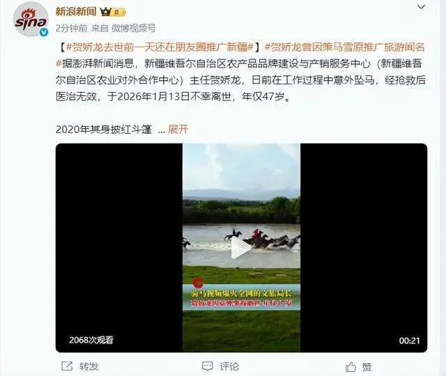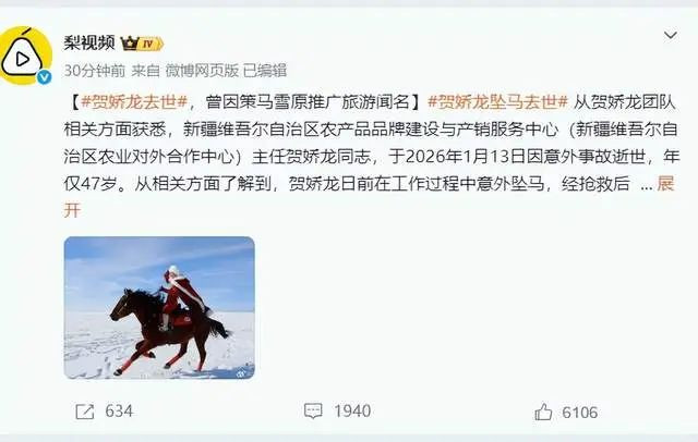 1月14号,据多家官方消息称,知名的网红,也是新疆农产品推广大使“马背上的货县长(后来因职位变化,改为货局长)”贺娇龙不幸去世,年仅47岁。