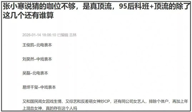狗仔给出了几个关键信息——科班出身和国民闺女A因戏生情、综艺捆绑反差萌女星B、95后小花C和他签同一个公司、恋上混血年上姐D。