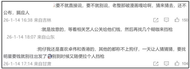 网友猜来猜去发现狗仔的爆料看似详细,但指向性并不明显,随便扒一扒就能有几个男星“入围”,搞得网友在评论区吐槽,要是想爆料就直接爆,这种谜语瓜看着就像是等着明星公关找上门要钱的一样。