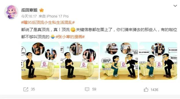 但是,"瓜田寒姐"全程使用漫画代号(如“小A”“小B”),没有提供亲密照、行程重合等直接证据,纯属捕风捉影去博眼球。