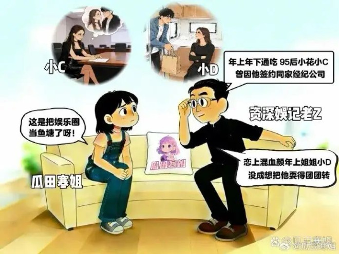 资深记者老Z透露,他年上年下通吃,95后小花小C曾因他签约同家经纪公司,恋上混血颜年上姐姐小D,没成想把他耍得团团转,瓜田寒姐立即叹息:“这是把娱乐圈当鱼塘了呀!”