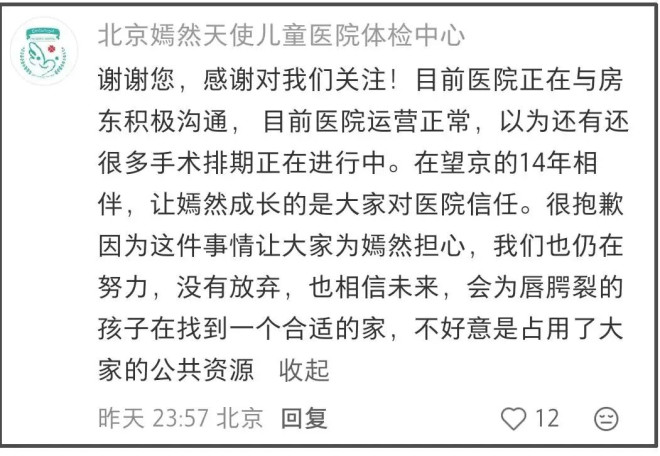 与此同时,嫣然天使医院官方账号也在每个声援支持他们的评论区留言感谢,还表示医院手术排期正常运行,会给所有病患找到一个家。