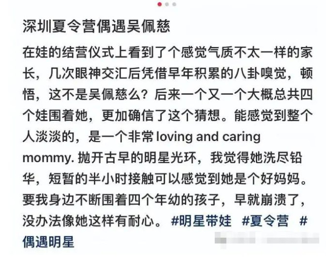 该网友还透露,吴佩慈确实是个好妈妈,虽然有保姆帮她带孩子,但四个孩子都围着她转,而她也非常有耐心的与每个孩子沟通。即使是普通的素人,也不一定能做到吴佩慈这样带四个娃的耐心。