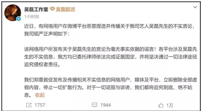 很快,吴磊工作室发文辟谣,表示有网络用户恶意捏造并传播关于吴磊的不实言论,他们会通过一切法律途径追究侵权者责任,接着就是熟悉的警告网友环节,吴磊工作室要求网络用户、媒体和平台立即删除全部虚假内容,停止一切扩散行为。