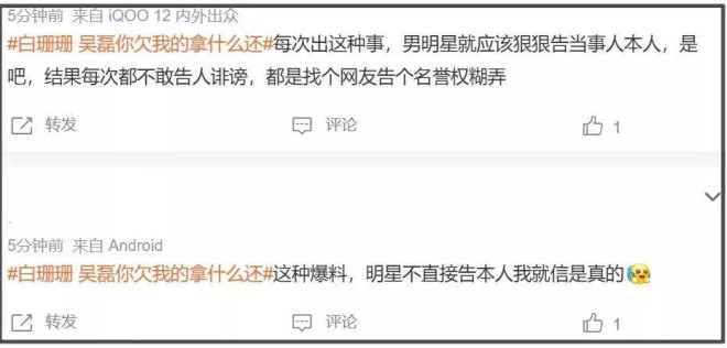 有人认为爆料女主没发吴磊照片,更没有指出自己爆料的是哪个吴磊,吴磊工作室跳出来反倒是对号入座了;有人认为吴磊工作室没有点名白珊珊、没有第一时间起诉,澄清力度还是不够。