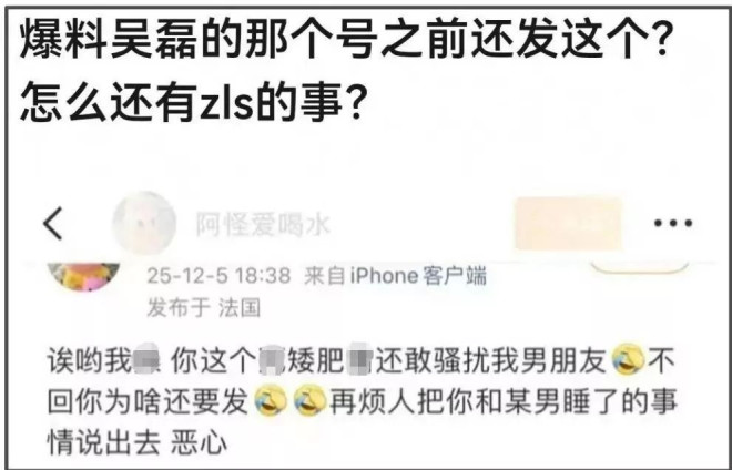 疑似爆料女主小号还发过一条动态,开口就是脏话,嘲讽某个又矮又胖的人骚扰她的男朋友(按照爆料女主的说法,她的男朋友正是一个叫吴磊的人)。