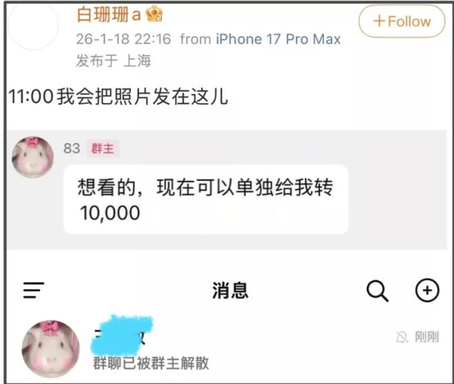 还有爆料女主本人,似乎有了偃旗息鼓的意思,她开了个群表示要发照片,要求网友付费被拒绝之后,火速解散了群,除了文字爆料,暂时没有拿出更多实锤。