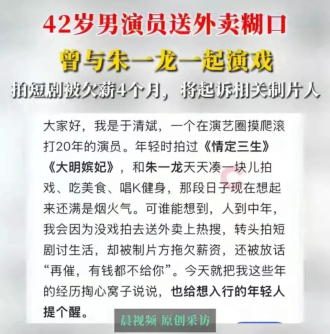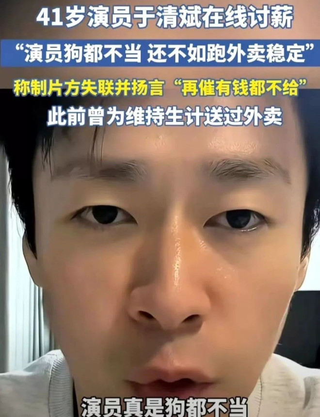 另一边是42岁演员于清斌宣布起诉欠薪制片人,为了讨回一万多块钱,他已经被耗了整整四个月,期间还得靠送外卖勉强糊口。同样是在演艺圈打拼,境遇的天差地别,不由我们不感慨。
