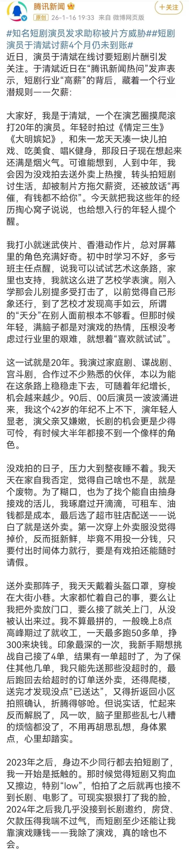 于清斌的遭遇根本不是个例,而是短剧行业野蛮生长的缩影。这个行业看似热闹,背后全是藏不住的乱象。超过六成的短剧配角、群演都没有书面合同,全靠微信群接戏、口头约定薪资,维权时连个凭证都拿不出来。更离谱的是,行业里超过四成的从业者都被欠过薪,群演集体欠薪人均还不到六百块,很多人嫌维权成本高,只能自认倒霉。