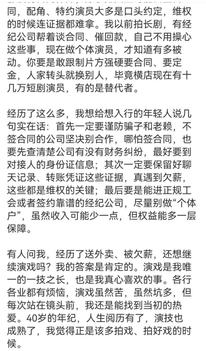 对于于清斌这样的中年演员来说,本来转型就难,日均拍摄十六个小时熬得身心俱疲,随身携带速效救心丸都是常态,最后连辛苦钱都拿不到,换谁能受得了。更残酷的是,小额欠薪的诉讼成本,往往比欠薪金额本身还高,这就让很多人只能放弃维权。