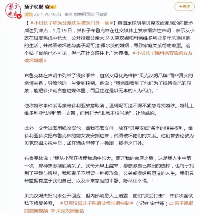 据1月20日报道,其长子布鲁克林·贝克汉姆在社交媒体上发表爆炸性声明,公开控诉父母多年来为维护“贝克汉姆品牌”而操控家庭成员生活、破坏其婚姻,并明确表示拒绝和解,将这场酝酿已久的豪门家庭矛盾彻底摊在了全球公众面前。