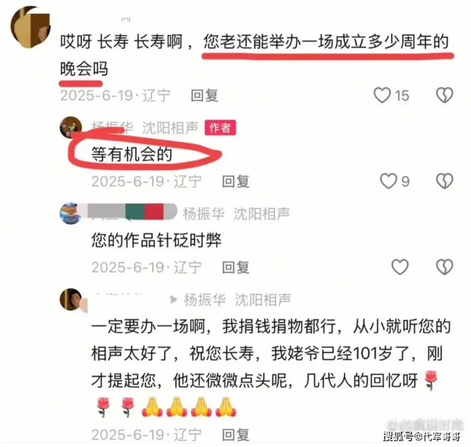 互动区里,有粉丝热切提议希望他能办一场周年晚会,杨老先生欣然应允,一句“等有机会的”,让无数喜爱他的人满怀期待,盼着能再一次在舞台下聆听他的幽默与智慧。可谁也未曾想,这随口的约定,竟成了他与观众之间永远无法兑现的承诺,也成了先生艺术生涯里最令人扼腕的遗憾。