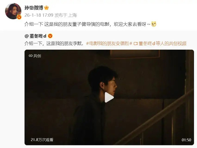 2026年1月18日,这场时隔多年的公开互动,让全网再次为他们的体面动容。孙怡转发董子健导演处女作《我的朋友安德烈》,用“我的朋友”定义彼此,既呼应了电影主题,又坦然表示了当下的关系;董子健则同样用“我的朋友”评论致谢,分寸感拿捏得恰到好处。