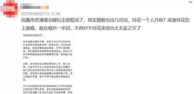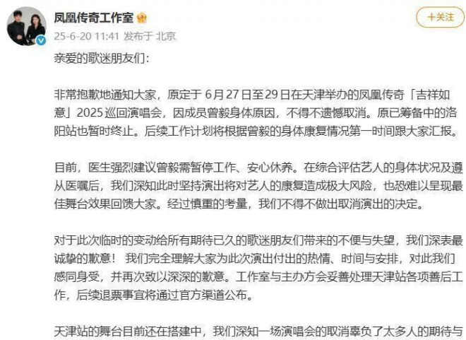 风暴在六天内席卷了一切。 凤凰传奇的汽车代言被暂停,母婴品牌合作终止,原定在天津、洛阳等地的十余场演唱会陆续取消,业内估算直接商业损失超过2000万元。 所有公告都统一写着“因成员曾毅身体原因”,但“软封杀”的传闻开始不胫而走。