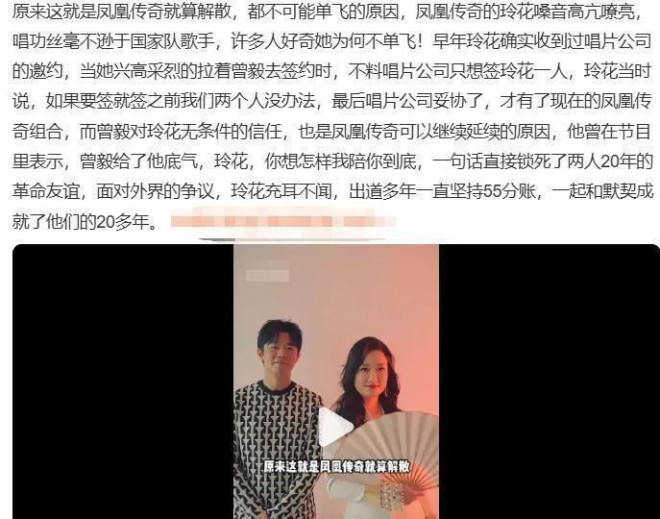 玲花曾总结凤凰传奇能够长久的三条法则:把对方当股东,而不是员工;吵架后先算账,再算情绪;上台前对视三秒,眼神里说‘我信你’。 在曾毅幕后负责演出策划、商务对接时,玲花在台前唱主角,这种纯粹的关系模式,避开了许多组合因利益不均而解散的陷阱。