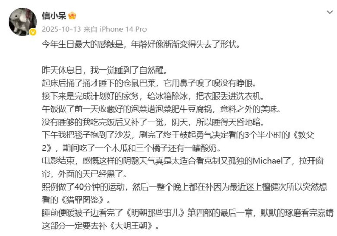 如今,从信小呆的微博看,她似乎早已走出当年的阴影,过得挺惬意。