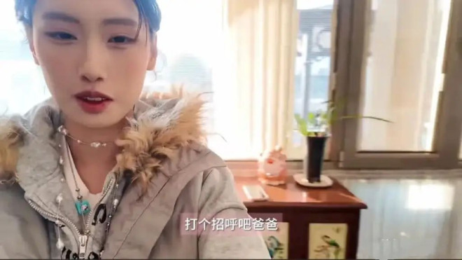 录视频的过程中,冯小刚刚好起床了。被女儿拉过来对着镜头打招呼,冯小刚穿一件黑色毛衣、绿色马甲,头发都花白了,私下里是个很慈祥的老父亲。
