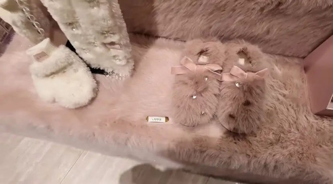 徐朵还逛了好多品牌店,看中了一双999的毛绒拖鞋。这拖鞋看着就暖和,还点缀了粉色蝴蝶结,可可爱爱的,就是999的价格属实有点贵了。