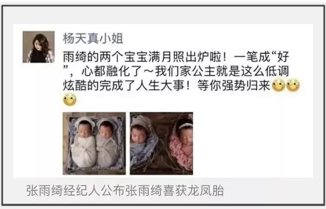 但杨天真在张雨绮生孩子这事儿中扮演的到底是什么角色,真的很难看清。张雨绮怀孕生子后,她在朋友圈帮忙官宣喜讯,直接晒出了两个宝宝的满月照,还强调“一笔成好”,倘若葛晓倩晒的代孕文件属实,那杨天真这一出是干啥呢?
