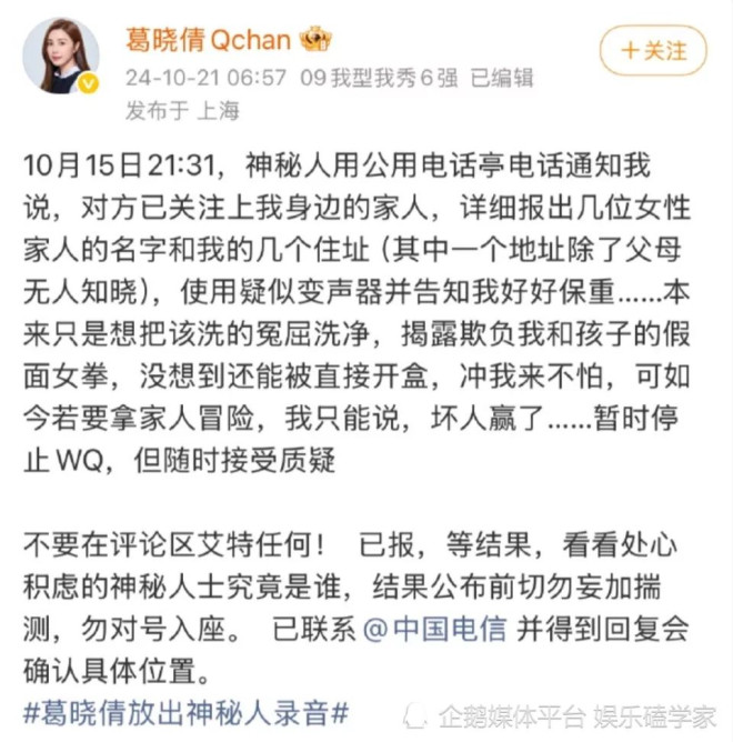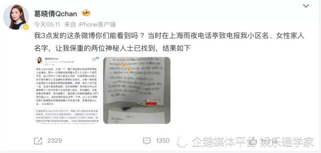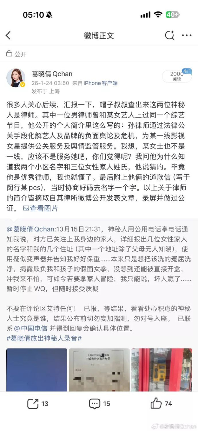 葛晓倩称警察调查结果证明打电话威胁的是两位律师,其中一位律师和某女星上过同一个节目,该律师公开业务显示长期为某一线女星提供舆情监督服务。当她追问律师为何得知她的住址及家人等信息,律师打马虎称是猜的。