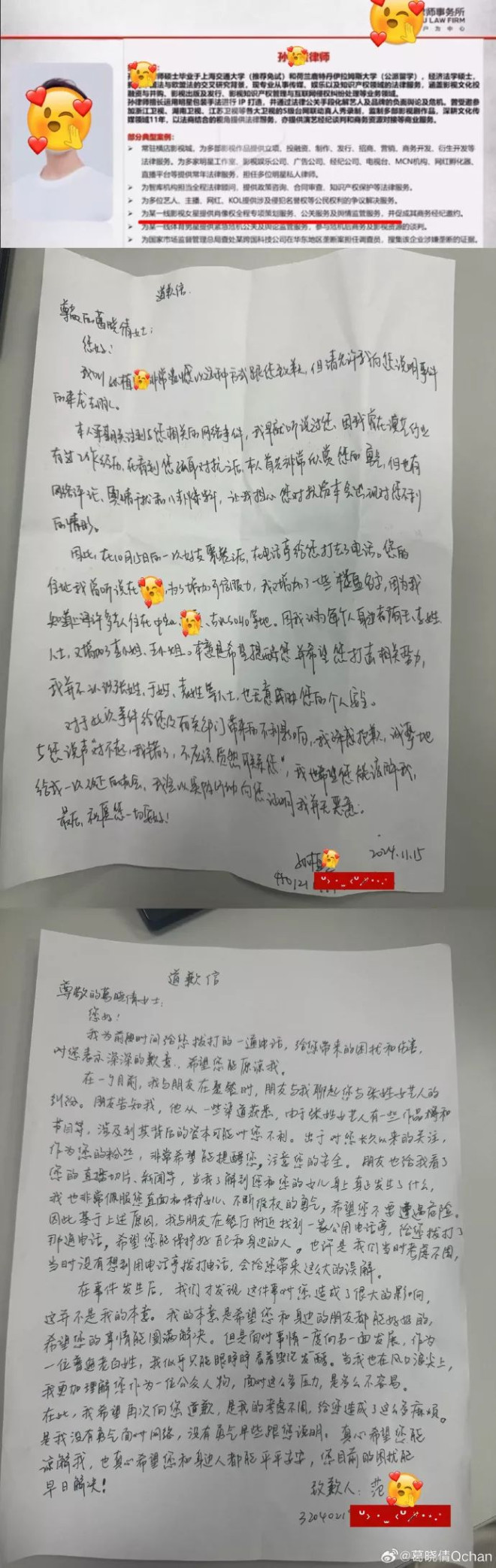 从葛晓倩晒出的两位律师道歉信来看,二人都承认了拨打电话的行为,并就此事造成的伤害致歉。但谈及缘由时,他们均声称不认识张雨绮,还辩称打电话是想为葛晓倩 “分担解忧”,将此番举动归为粉丝关心过度的贸然行为,同时表示获取联系方式的渠道是楼盘信息。