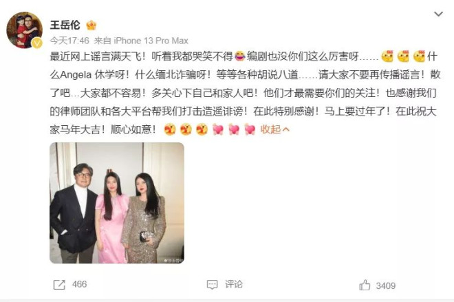 王岳伦在微博发文称:“最近网上谣言满天飞!听着我都哭笑不得。编剧也没你们这么厉害呀……什么Angela 休学呀!什么缅北诈骗呀!等等各种胡说八道……请大家不要再传播谣言!散了吧…大家都不容易!多关心下自己和家人吧!他们才最需要你们的关注!也感谢我们的律师团队和各大平台帮我们打击造遥诽谤!”