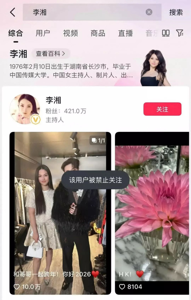 李湘的抖音帐号页面显著标示“该用户被禁止关注”,若点击“关注”按钮,后台会发送即时提示“该用户被禁止关注”。李湘最新一条抖音于2025年12月31日发布,内容为女儿王诗龄(Angela)与艺人张艺兴一起跨年的图片。