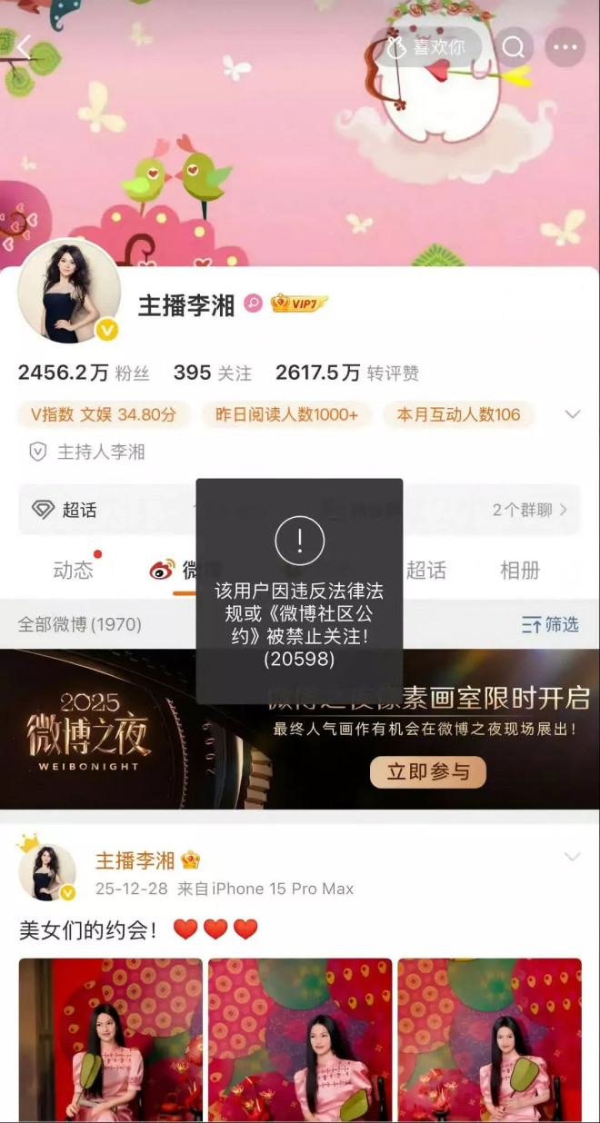 李湘微博提示:该用户因违反法律法规或《微博社区公约》被禁止关注。(微博)