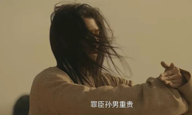 黄沙漫天,石重贵发丝凌乱、简衣粗布,氛围极其悲壮。