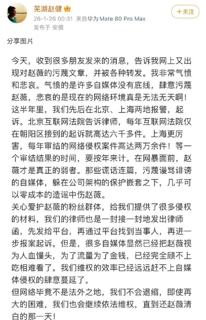 在“赵薇”的名字屡次和“缅北”联系在一起之时,赵薇的亲哥哥赵健为了妹妹挺身而出。1月26日,他利用自己的社交平台,公开对外发声,痛斥造谣者。