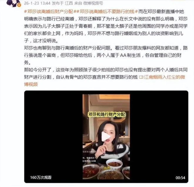 曾带着富豪丈夫路行录制《再见,爱人》的邓莎,最近的一场直播中谈到已离婚,并回应了财产分割问题,且硬气地表示:“不要他的钱!”