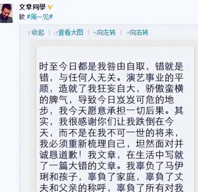 声明中,文章写道:“吾爱伊琍,同行半路,一别两宽。 ”马伊琍的回应更冷静:“你我深爱过,努力过,彼此成就过,此情有憾,然无对错。 ”文章后来坦言,他早就看透马伊琍的清醒,“她不会为了感情失去自我”,而这种清醒恰恰让他无地自容。