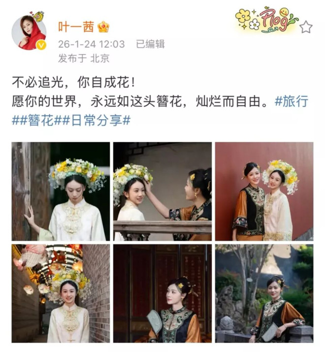 近日,叶一茜在社交平台晒出一组和女儿森蝶的簪花合照,打卡中式浪漫。母女同框颜值养眼,17岁的森蝶越来越像妈妈。