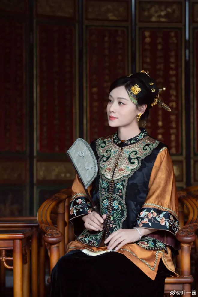 叶一茜身穿黑色新中式重工刺绣套装,手拿扇子,坐在椅子上,一颦一笑看起来很有当家主母范儿。虽然才41岁的叶一茜选的这身造型有点老气,但因为她颜值在线,看起来还是很年轻貌美的。