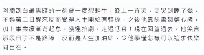 46岁香港男星张继聪因为搞笑演技走红,没想到他居然患有抑郁症,而且一度想过自杀,不过看完心理医生后,觉得自己没资格得这个病。