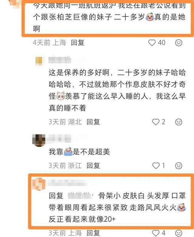 这条动态的评论区里,有网友分享了和她坐同一趟航班飞上海的经历,说她皮肤紧致,走起路来风风火火,不像45岁,更像是20出头的样子。