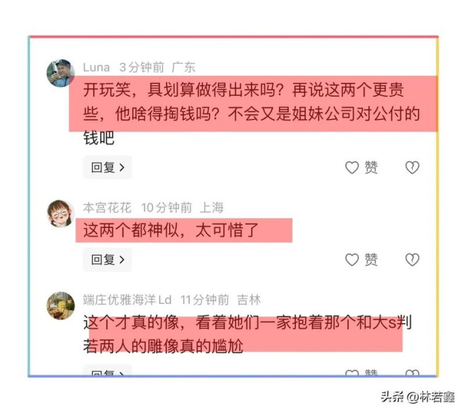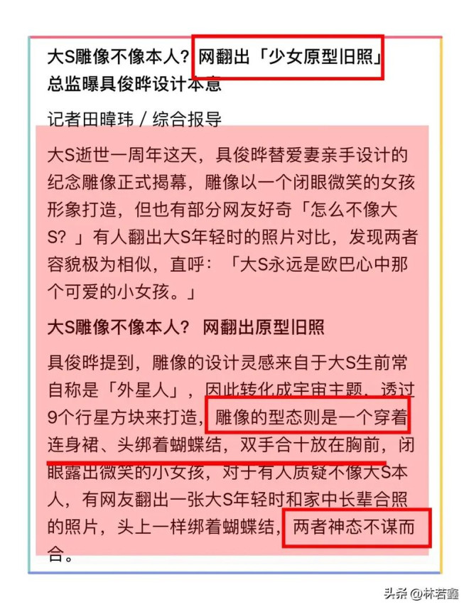 可是雕像的形象确实引起了很多网友的不满,蔡康永在现场说:每个人都在心里为大S立了一个雕像,这是具俊晔心目中的大S,网友说虽然他有权利,他想传递的是大S的精神,可是他也应该考虑粉丝和大S儿女的感受,站在雕像前诉说哀思,抬起头怎么看这卡通少女也联想不出大S的面容,哪怕有一点点像,或者是大S小时候也可以啊,不然总觉得容易出戏,不过网友的心中也有一个大S雕像,众人都感觉比具俊晔的好很多!