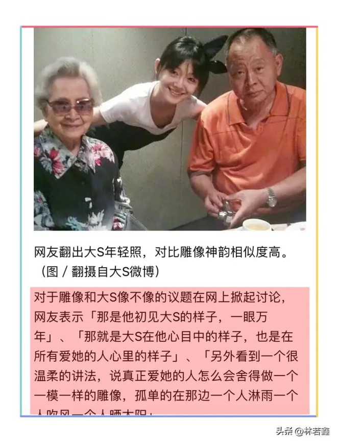台媒也看到了网友们对雕像的热议,晒出了大S年轻时候跟家人的一张合照,就是头戴蝴蝶结,台媒说这张照片就是大S雕像原型,很神似!