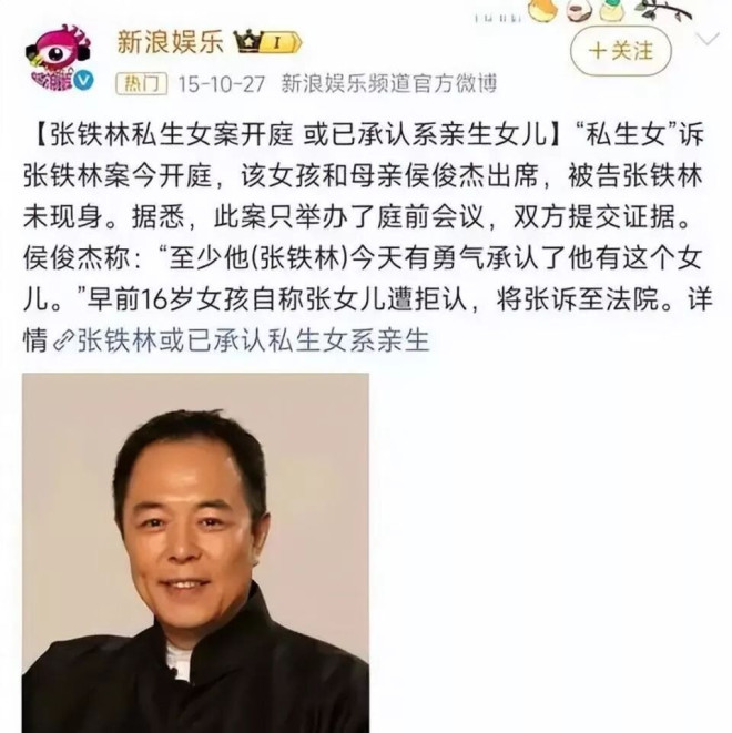 九十年代中期,张铁林选择回国发展。 年近四十的他,凭借早年积累和独特气质,开始在影视圈崭露头角。 1997年,他遇到了生命里又一个重要的女人——侯俊杰。 当时侯俊杰只有23岁,是北影的校花,正值青春年华。 两人同居了,侯俊杰很快怀孕。 对于这个孩子,张铁林的态度被侯俊杰在后来的诉讼中描述为“反对和冷漠”。 他 reportedly 以“影响事业”为由,要求女方放弃孩子。 但侯俊杰坚持生了下来,1999年,女儿张楠(化名)出生。 孩子的到来并未巩固关系,反而加速了破裂。 张铁林被指长期失联,拒绝承认父女关系,也未支付抚养费用。