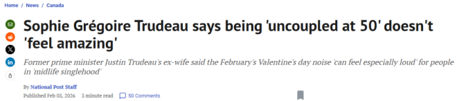 在情人节前夕,苏菲·格雷瓜尔·特鲁多(Sophie Grégoire Trudeau)向粉丝和关注者分享了一段相当私人的感悟,谈到自己在50岁时处于“uncoupled(单身)”状态,以及如何适应“中年单身”带来的挑战。