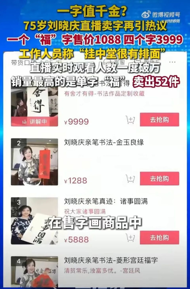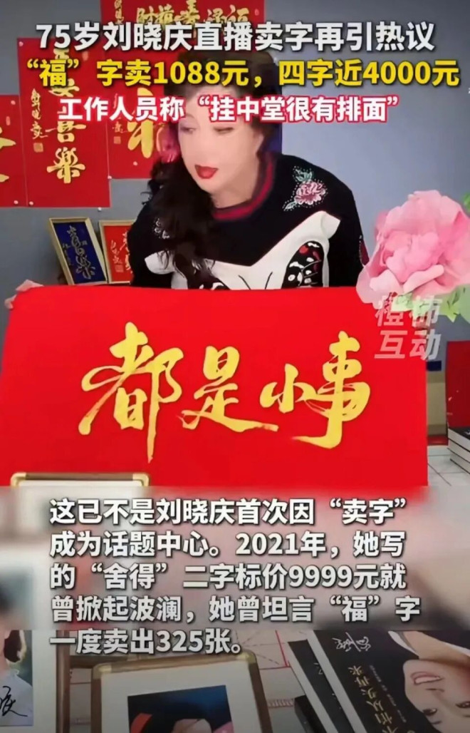 刘晓庆的手写书法,单字“福”1088元,四字“平安喜乐”3888元,网友们调侃,这才是真正的“一字千金”。