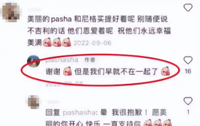 2022年9月,帕夏古丽在社交媒体上看到一条祝福她与尼格买提婚姻幸福的留言。 她没有选择忽略,而是直接回复:“谢谢,但是我们早就不在一起了。 ”这11个字的回应,为一段近十年的感情画上了句号。