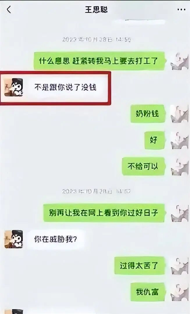 黄一鸣在社交媒体上发布视频,直接摊牌了。 她公开指认王思聪就是闪闪的生父,并且亮出了聊天记录作为证据。 记录里的对话,彻底撕开了温情脉脉的想象。 黄一鸣找王思聪沟通抚养费的问题,对方的回复冰冷而简短:“没有钱,你忍一忍。 ”这句话瞬间引爆网络。 王思聪自此彻底隐身,从未公开承认过这个孩子,也没被拍到看过孩子一眼。