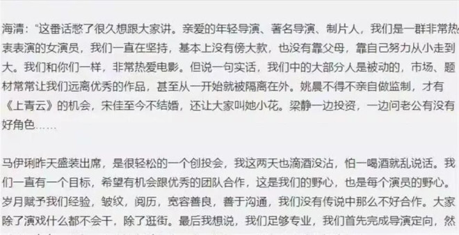 她说她们“没有傍大款,也没有靠父母”,说她们“比胡歌便宜,和他一样好用”,呼吁导演们给机会。 场面一度非常尴尬,旁边的宋佳直接黑脸,甩下一句“此观点仅代表海清个人立场”,就下了台。 周冬雨也赶紧说“我还没到中年”。