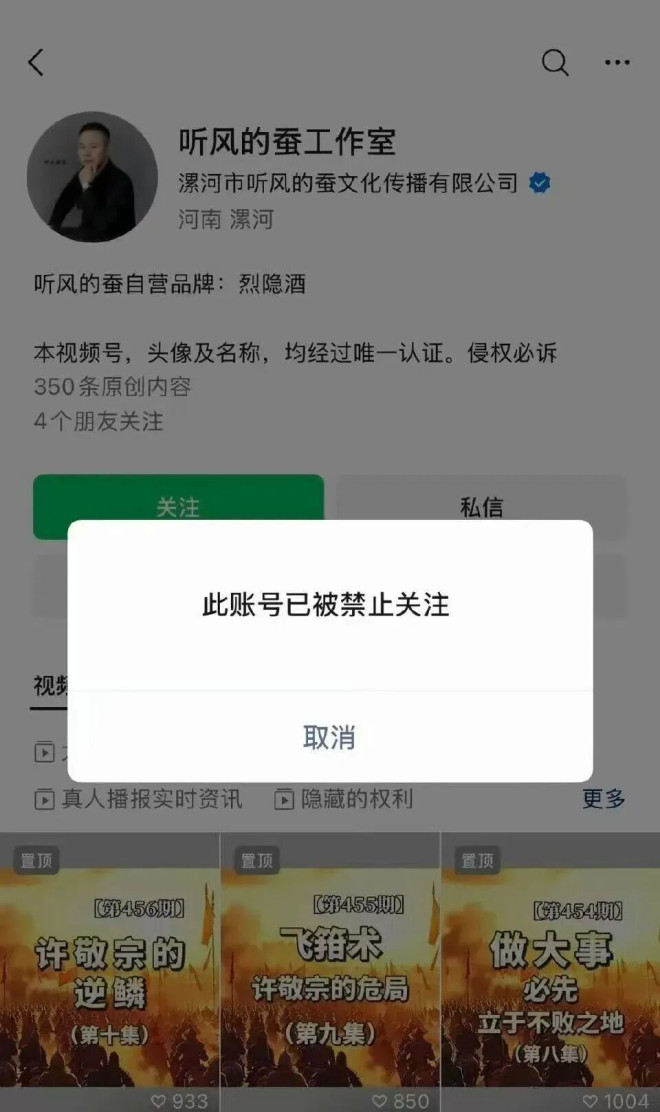 拥有近2000万粉丝的军事类顶流网红“听风的蚕”,账号突然异常。