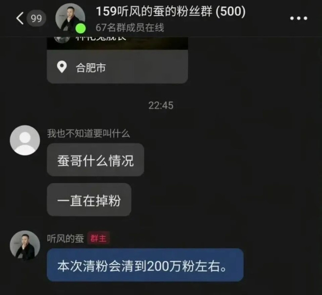 更让人不齿的是,面对账号异常掉粉的消息,“听风的蚕”的工作室,没有坦诚认错,反而在粉丝群里谎称,掉粉是“正常清理”。
