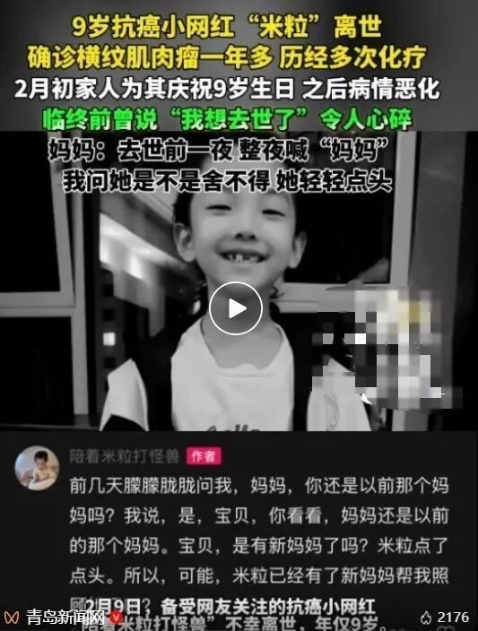 9岁网红确认离世,去世前喊了一晚上妈妈,1周前刚过完生日,九岁的年纪,本该在操场上追逐嬉闹,在作业本上写下歪歪扭扭的字迹,在睡前缠着妈妈讲一个又一个故事,可对“小米粒”来说,这一年却是在病房、药水味和消毒水气息中度过的。