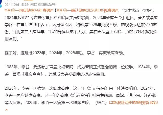 李谷一生病,也是在近几年,因新冠病毒感染,2023年开始,便缺席了春晚,一开始只知道,只是轻飘飘的病了。