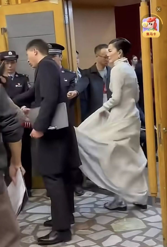 她穿白色修身呢大衣,内搭许是演出时的拖尾长裙,同样是白色系。拖尾款的设计,比去年的白裙更华丽繁杂了些。