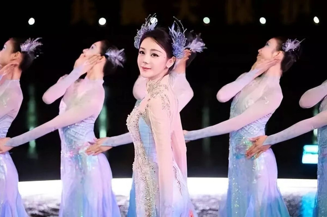 修身的白蓝连衣裙虽然显身材,但也让热巴看起来更壮硕,尤其是腰胯特别宽,比不上伴舞的身材。